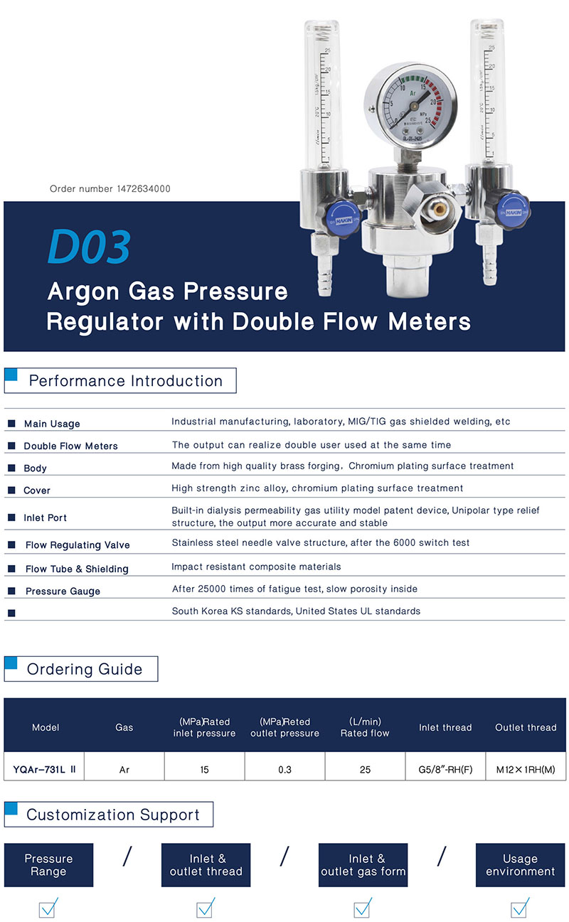 Argon Gas Pressure Regulator with Double Flow Meters